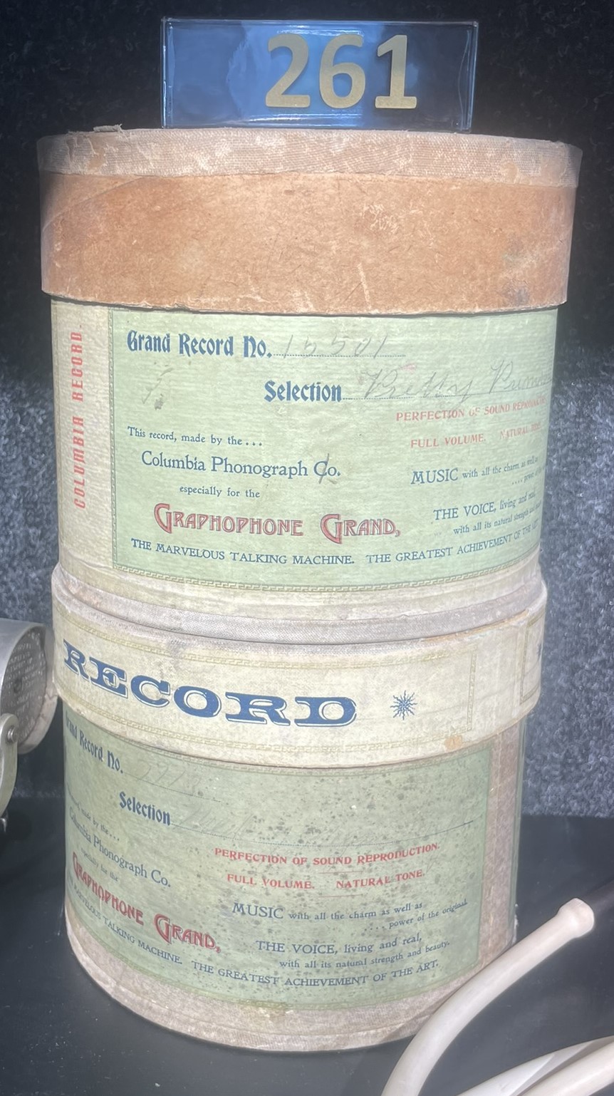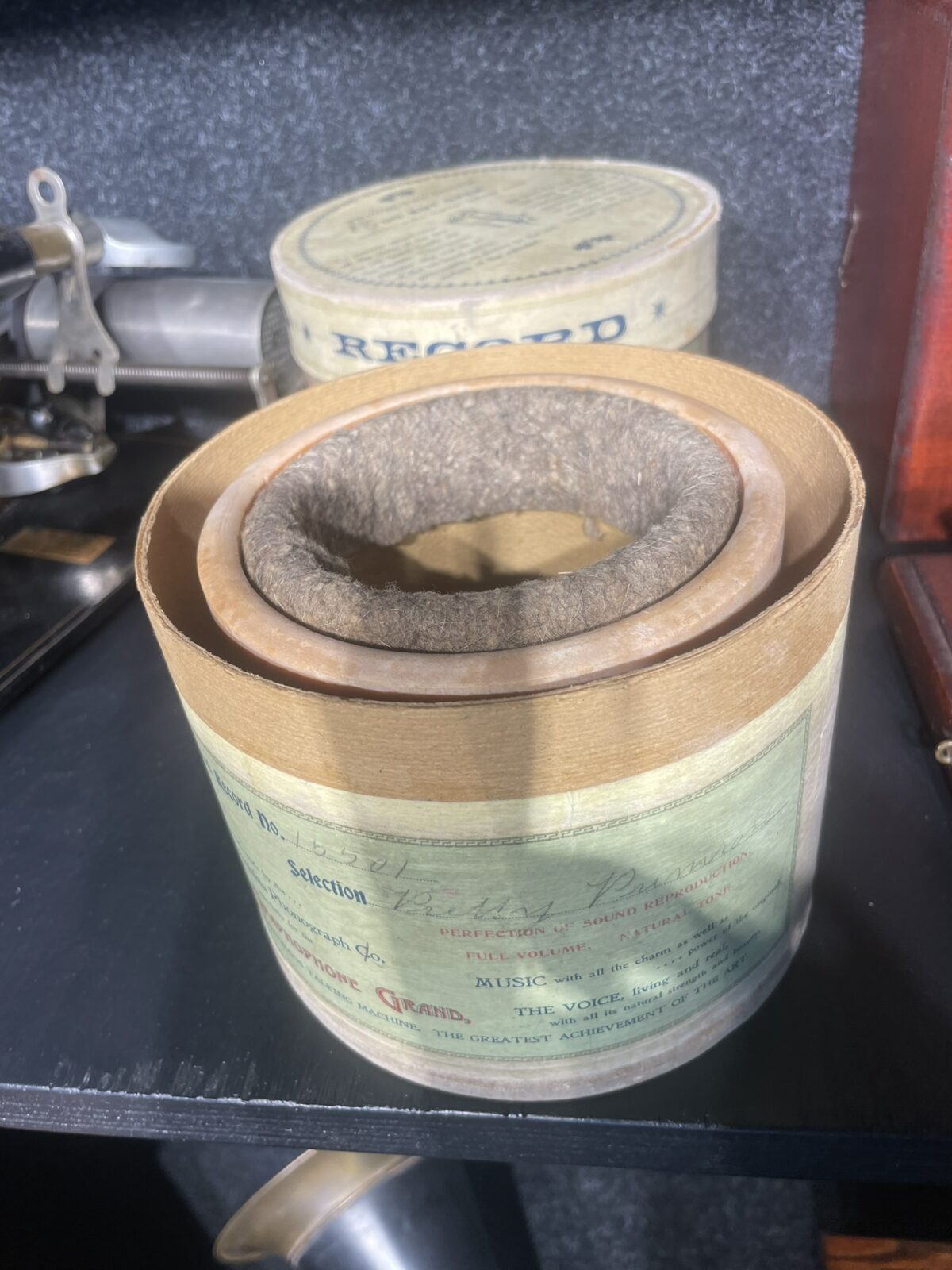 Etikett: grün bedruckt, mit Aufschrift “Made especially for the Graphophone Grand – The Marvelous Talking Machine”